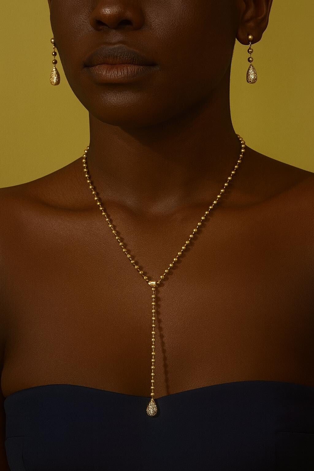 Le collier en Y est composé de perles dorées et s’achève sur une goutte scintillante, sertie de pierres fines.